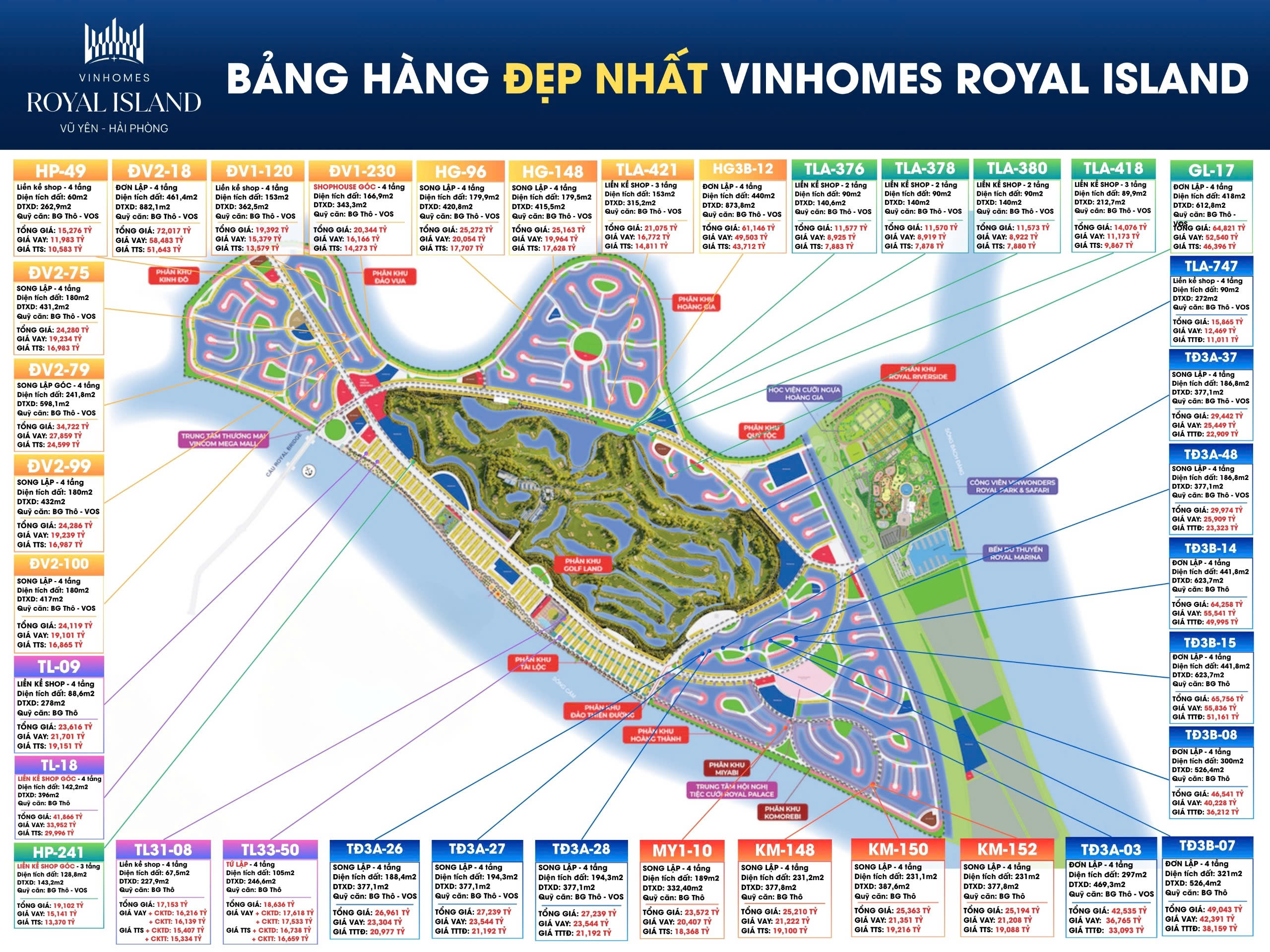 Vinhomes Royal Island là dự án lớn nhất khu vực, với những tiện ích đạt đẳng cấp quốc tế với đa dạng sản phẩm cao cấp gồm: Nhà Biệt thự, Nhà liền kề, Nhà phố Shophouse và vô vàn các tiện ích cao cấp và quy mô khủng. Với mức giá bán và chính sách vô cùng ưu đãi & linh hoạt luôn tạo điều kiện để nhiều đối tượng khách hàng có nguồn tài chính phù hợp sở hữu. Cùng chúng tôi điểm qua mức Gía bán điển hình của các sản phẩm tại dự án: