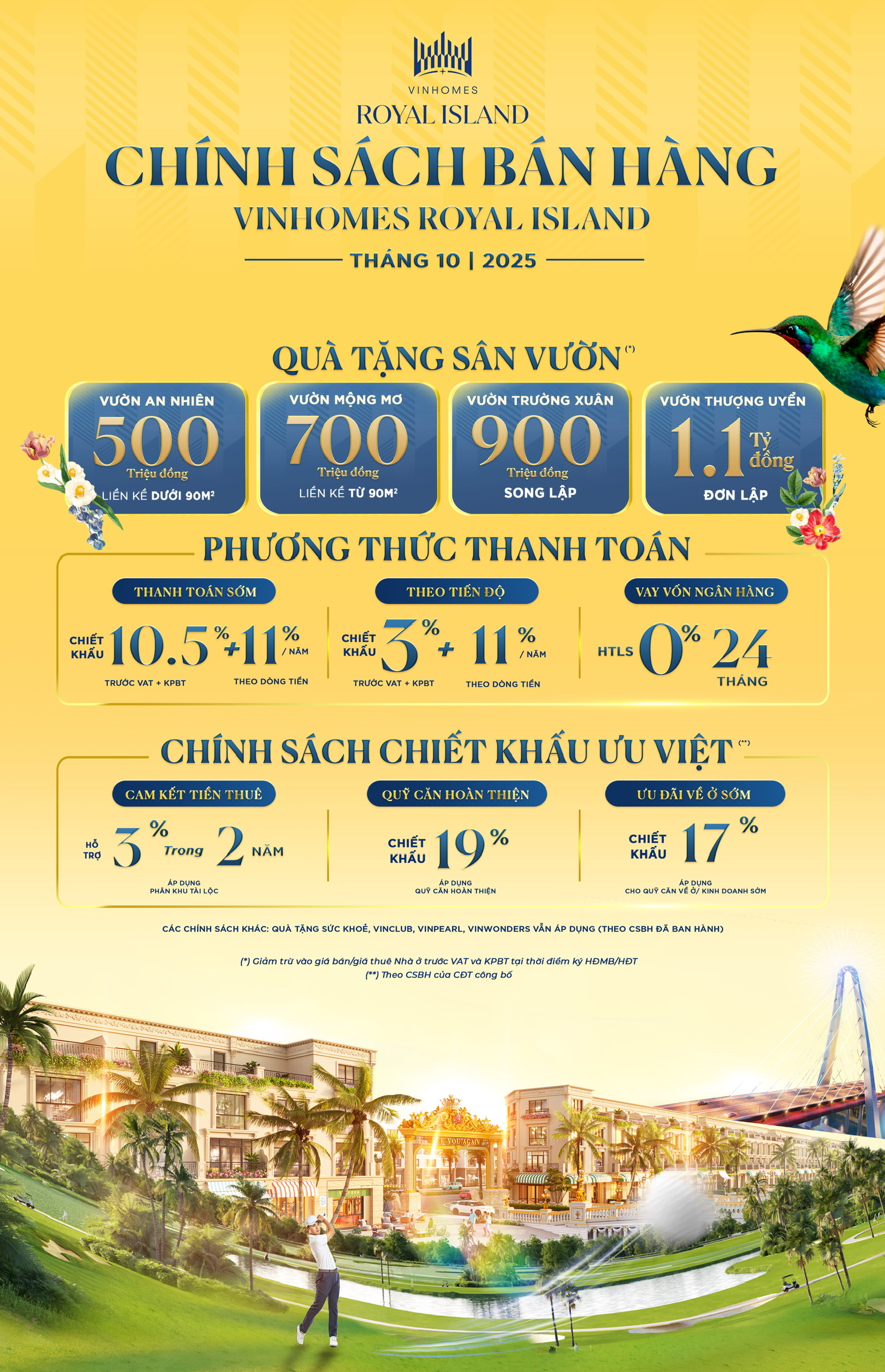 Tháng 10 này, Vinhomes Royal Island tiếp tục khuấy đảo thị trường với chính sách quà tặng sân vườn giá trị lên tới 1,1 tỷ đồng, dành riêng cho khách hàng sở hữu dòng căn diện tích lớn