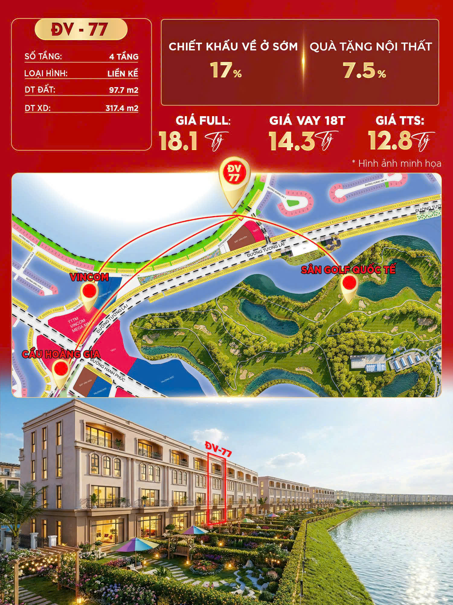 Sản phẩm Liền kề : có diện tích đất sổ đỏ ~100m2, được xây 4 tầng, mặt tiền 6m, TẶNG NGAY sân vườn view sông ~100m2.