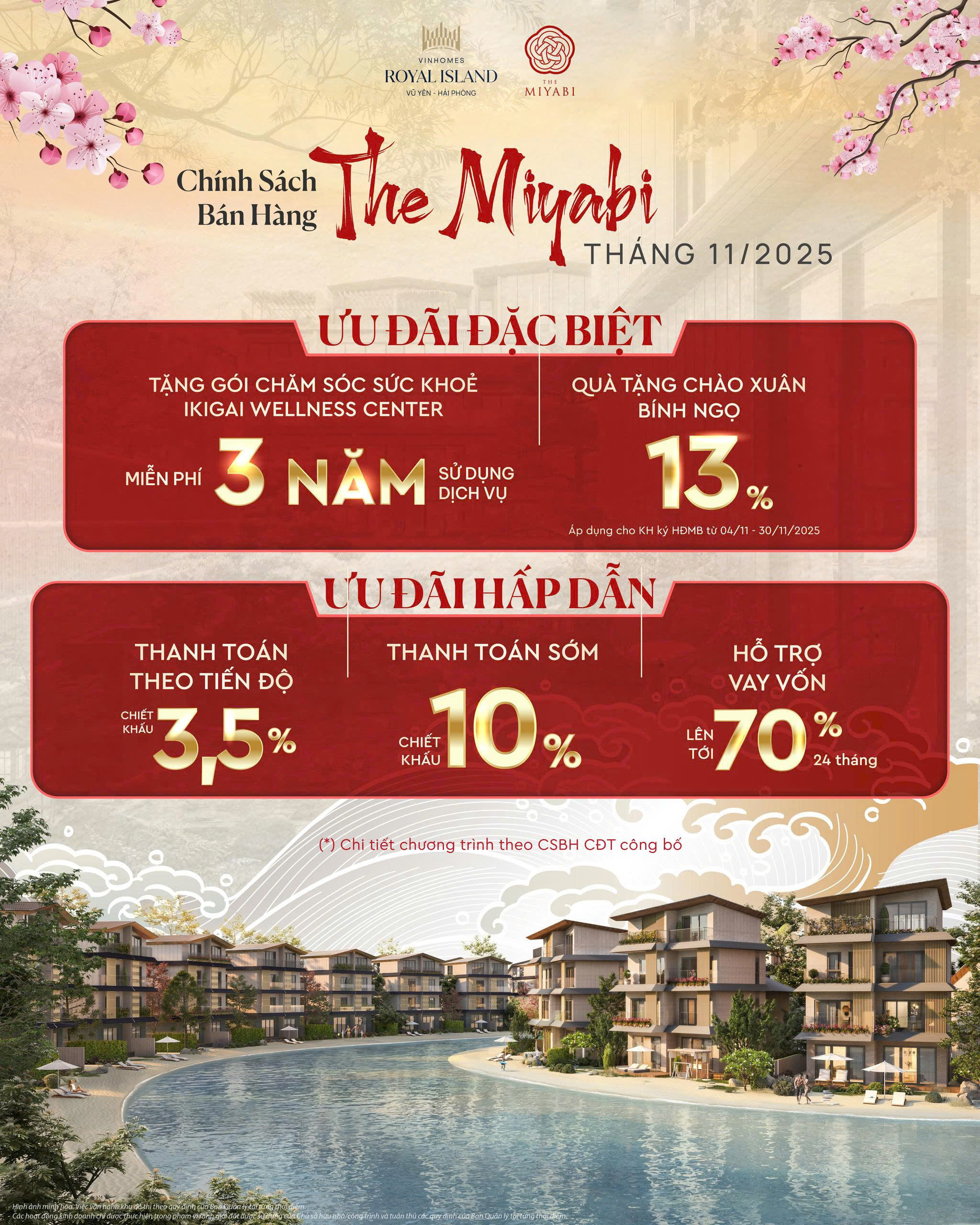 Tại Miyabi có khoảng 74 căn shophouse liền kề với diện tích từ 100m2 – 163m2 (nhưng chủ yếu là 100m2), có mật độ xây dựng từ 75 – 80% và mỗi căn cũng có 4 tầng. Các shophouse liền kề tại phân khu Miyabi nằm dọc theo 2 trục đường Hạnh Phúc và Miyabi 1. Giá bán hiện tại của shophouse liền kề Miyabi dao động từ 15 – 20 tỷ đồng. Lợi thế của những căn Shophouse ở phân khu Miyabi vô cùng lớn vừa có thể ở vừa có thể kinh doanh nhờ nằm trên trục đường chính của thành phố đảo Vinhomes Royal Island Hải Phòng.