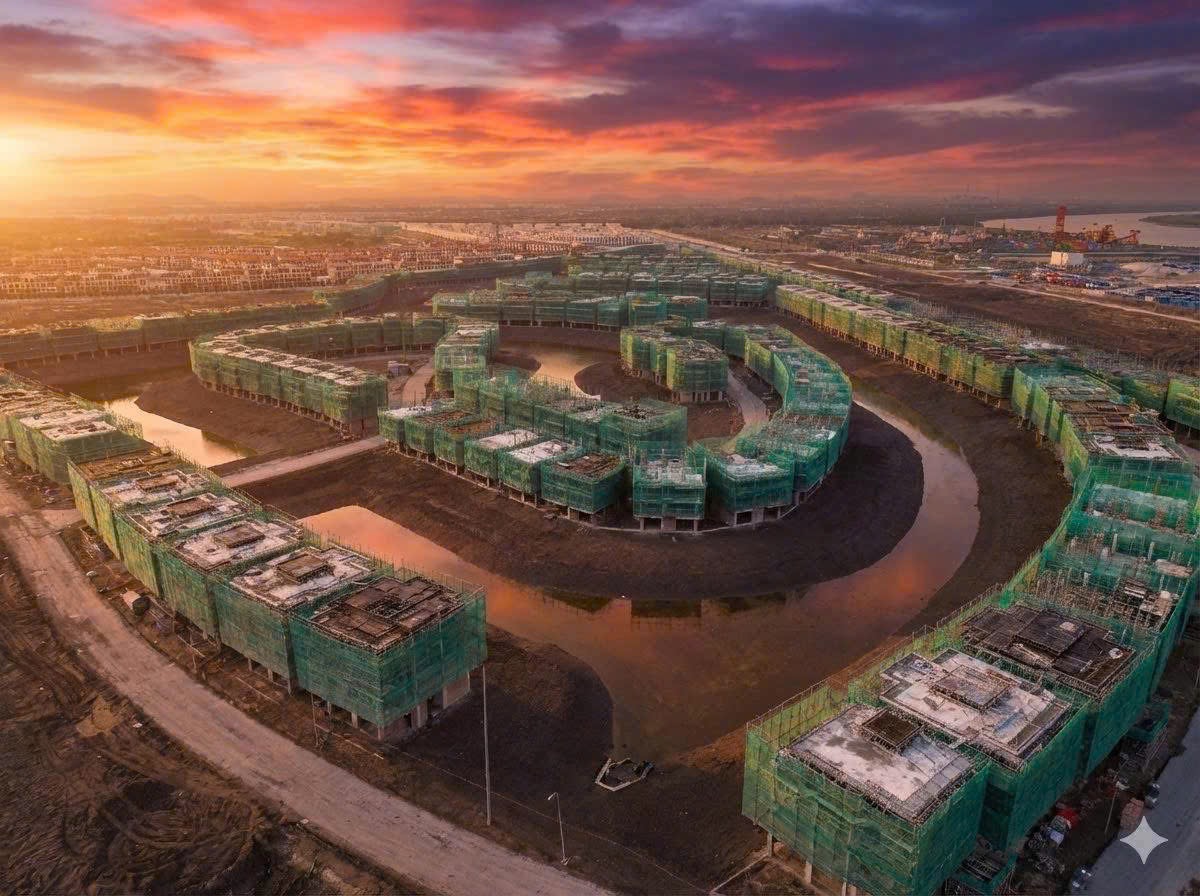 Các dãy biệt thự thấp tầng đã hoàn thiện phần kết cấu, thi công lên tầng 3-4 theo từng cụm, đảm bảo sự thống nhất về kiến trúc và tiến độ tổng thể.
